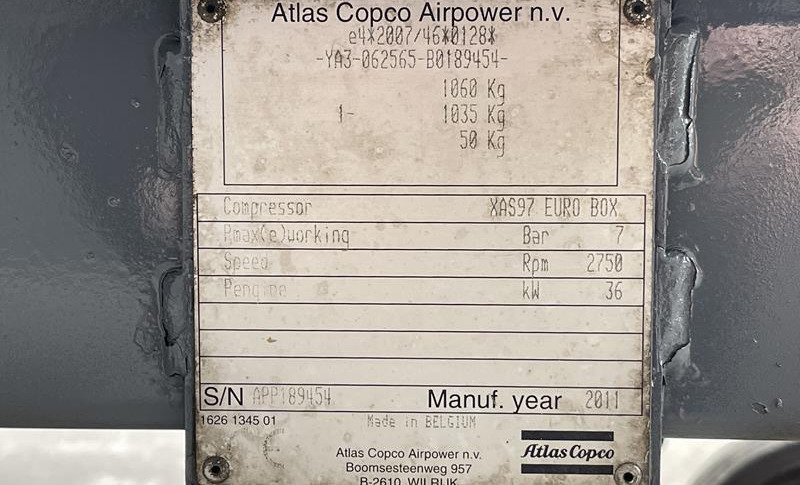 L'Atlas Copco XAS 97 DD - N del 2011 è un compressore mobile usato affidabile, perfetto per le imprese edili, le società di noleggio e i progetti industriali in Belgio e in Europa. Con sole 2.678 ore di funzionamento, questa macchina è pronta per l'uso immediato e offre prestazioni efficienti senza sacrificare la capacità o la pressione dell'aria.
