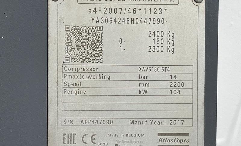 Atlas Copco XAVS 186 JD 2017 to niezawodna używana sprężarka przewoźna idealna dla firm budowlanych, wypożyczalni i projektów przemysłowych na całym świecie. Dzięki maksymalnej wydajności 10,4 m³/min i ciśnieniu roboczemu 14 bar maszyna ta zapewnia stabilną wydajność w różnych zastosowaniach. Po 1399 godzinach pracy jest gotowa do natychmiastowego użycia na każdym placu budowy, niezależnie od lokalizacji.